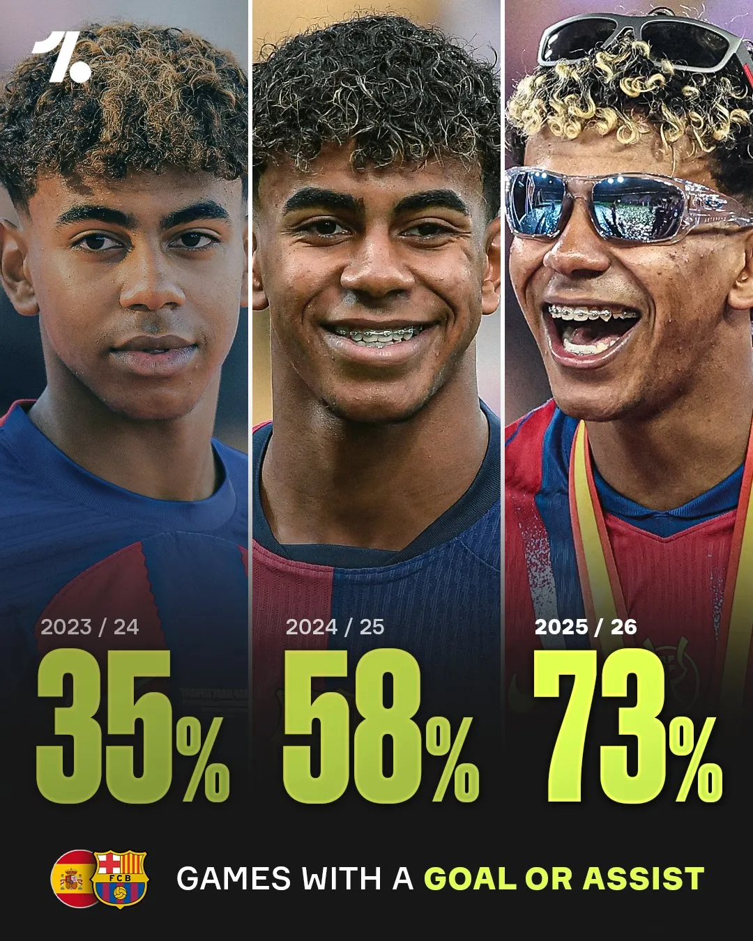 虎扑03月05日讯 据One Football的数据显示,拉明-亚马尔在每个赛季都在俱乐部和国家队持续贡献进球或助攻。而在2025/26赛季,他已参与的比赛中,73%都有进球或助攻入账。